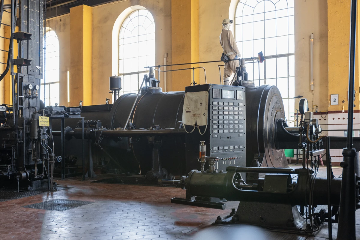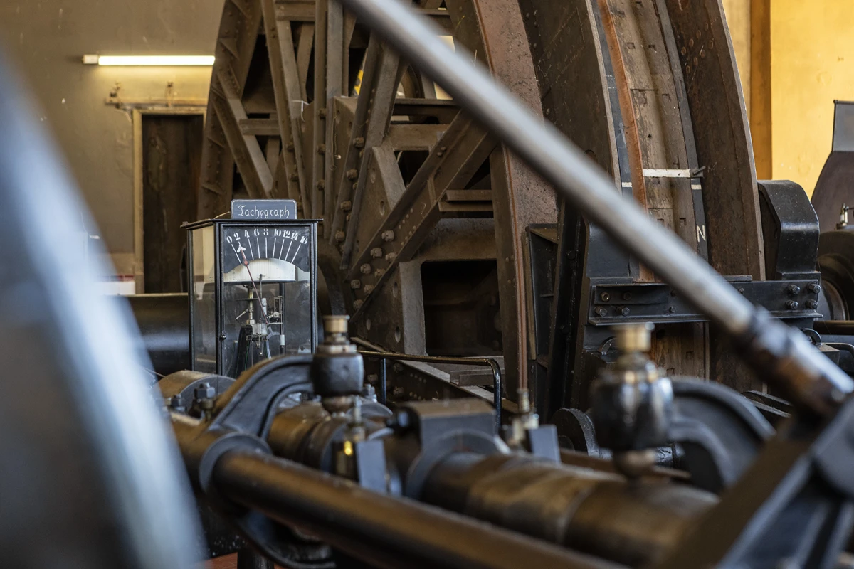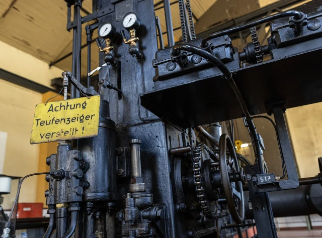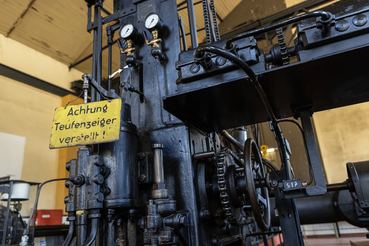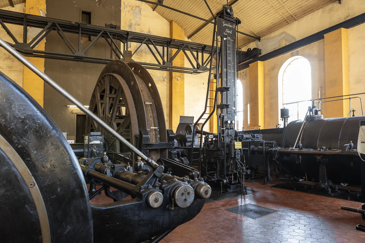 Der Gustavschacht II war ein Doppeltrum-Schacht, ausgestattet mit zwei unabhängigen Förderanlagen. Deshalb besitzt auch das Maschinenhaus eine Doppelbauweise. Während die Südmaschine leider verschrottet wurde, ist die Nordmaschine in außergewöhnlich gutem Zustand erhalten.